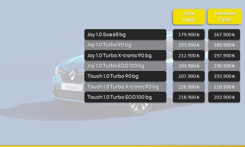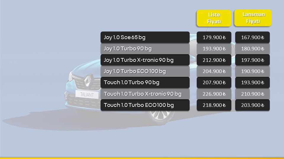 Renault’nun B-Sedan segmentindeki yeni oyuncusu Taliant, modern tasarım çizgileri, teknolojik donanımları, artırılmış kalite ve konfor unsurlarıyla B-Sedan segmentine farklı bir perspektif getiriyor. X-Tronic şanzıman ve LPG versiyonlarıyla en önemli ihtiyaçlara cevap veren Renault Taliant, satışa sunulacağı pazarlar arasında ilk kez 25 Mayıs’ta Türkiye’de yollara çıkıyor. Hem perakende, hem de filo kullanıcılarına yönelik sunduğu özelliklerle segment liderliği hedefleyen model, lansmana özel ve sınırlı sayıda stokla 167.900 TL’den başlayan fiyatlarla satışa sunulacak.